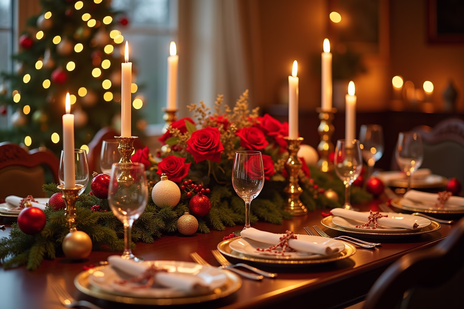 Der klassisch-elegante Stil zeichnet sich durch seine zeitlose Schönheit, edle Materialien und harmonische Farbgebung aus. Hier dominieren traditionelle Weihnachtsfarben wie Rot, Grün, Gold und Silber, die in Kombination mit hochwertigen Stoffen und filigranen Details eine festliche und stilvolle Atmosphäre schaffen. Stell dir einen Tisch vor, der mit einer schneeweißen Leinentischdecke bedeckt ist, auf der funkelnde Kristallgläser, edles Porzellan und glänzendes Besteck stehen. Rote Rosen oder Amaryllis in eleganten Vasen sorgen für einen Hauch von Romantik, während goldene Kerzenleuchter und silberne Serviettenringe für festliche Akzente sorgen.